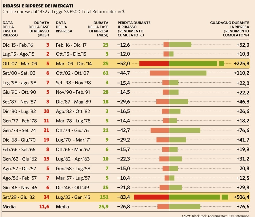 Che dalla Grande Depressione all'invasione della Francia da parte di Hitler, dalle Torri Gemelle alla crisi finanziaria del 2008, TUTTE le volte, e ripeto, TUTTE le volte il mercato negli anni successivi non ha solo recuperato ma è salito ben oltre i livelli raggiunti in precedenza.